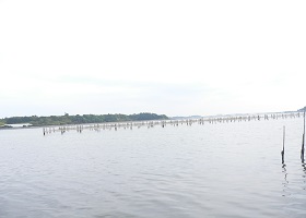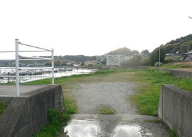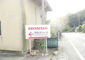 平松マリーナの看板の先に平松町の 屋台置き場があります。